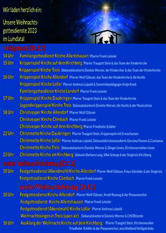 | 17:00 Uhr | Gottesdienst zu Heiligabend gestaltet vom Jugendausschuss und den Konfirmanden |