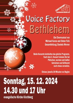 Wir laden herzlich ein zum Konzert der Voice Factory um 14:30 und um 17 Uhr auf dem Kirchberg. Beide Konzerte beinhalten das gleiche Programm. Nach dem 2. Konzert können Sie bei Plätzchen, warmen und kalten Getränken und Grillwurst noch etwas verweilen. Einlass: 30 Minuten vor Beginn.