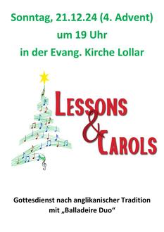 Diese Gottesdienstform stammt aus England und schildert mit Lesungen aus der Bibel und entsprechenden Liedern den Weg zum Weihnachtsfest. Dieser stimmungsvolle Gottesdienst wird vom "Ballareire Duo" musikalisch gestaltet.