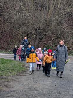 Die Kinder des Kindergartens auf dem Weg zum Vereinsheim des OGV