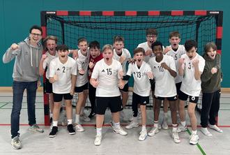 Die erfolgreiche Handball-Mannschaft der CBES (vl): Sportlehrer Tobias Bepler-Zimmermann, Luca Tomescu, Nick Schulz, Till Schmidt, David Flor Carvalho, Leo Jung, Leo Becker, Lenny Schmitt, Nikita Hörner, Abdigani Abdullah, Frederik Goedecke, Adrian Kasper und Sven Jäger.