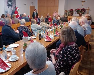 11 Kinder aus unserem örtlichen Kindergarten und der Leitung von Karin Kubatz brachten uns zu Beginn gleich ein Weihnachtsständchen, sie erhielten einen tollen Applaus, der Nikolaus belohnte sie mit Schokolade. Unser Nikolaus erwies sich überhaupt als "Tausendsassa": Er war darüberhinaus im Hol- und Bringedienst, saß zwischendurch am Klavier, animierte die Gäste zum Mitsingen und verteilte dann noch kleine Geschenke an die anwesenden Vereinsmitglieder, bedankte sich bei unseren oft kurzfristig einspringenden Aushilfen Helga, Ingrid, Roswitha und Erika mit einer der Jahreszeit eintsprechenden "Blumentopfpflanze".