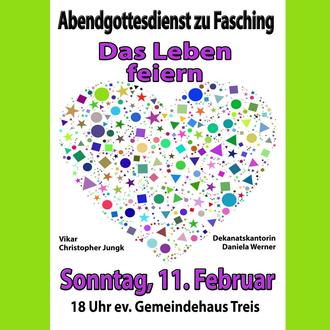 | 18 Uhr | Abendgottesdienst zu Fasching „Das Leben feiern“ mit Vikar Christopher Jungk, Dekanatskantorin Daniela Werner und dem Team des Kirchenvorstandes |