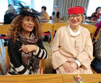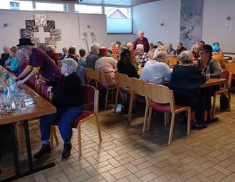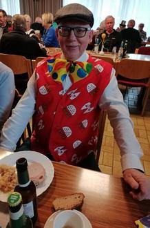 Die 72 vorbereiteten Sitzplätze im Gemeindesaal waren um 12.00 dicht besetzt. Der Duft von Sauerkraut, Rippchen und Kartoffelpüree lag in der Luft, als Reiner das Mittagessen eröffnete. Im feinen Zwirn mit Fliege begrüßte er die gut gelaunten, kostümierten Gäste und kündigte hochrangigen Besuch an. Schnell waren die vorbereiteten Portionen auf die Tische verteilt und die Besucher hatten ihr Mittagessen vor sich.