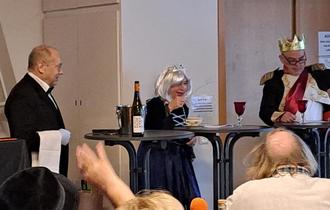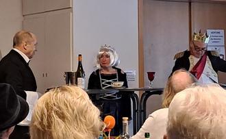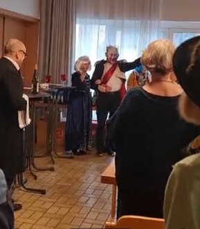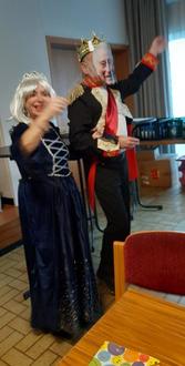Danach wurde es feierlich. Zu den Klängen der englischen Nationalhymne betrat das englische Königspaar ( Mechthild und Erwin ) den Saal und begrüßte, huldvoll die Gänge durchschreitend, die in Ehrfurcht erstarrten Senioren. Die Spekulationen um den aktuellen Gesundheitszustand des Monarchen verstummten, hatte er doch seinen Staatsbesuch in Treis für diesen event um 3 Tage verlängert! Zusammen mit seiner Gattin, Queen Camilla, erörterten beide die verwandtschaftlichen Beziehungen beider Linien des Königshauses mit Treis. Sie konnten mit nahezu allen alten Treiser Dorfnamen etwas anfangen! Viele Probleme des Königshauses kamen zur Sprache und es wurde deutlich: auch im Königshaus menschelt es!