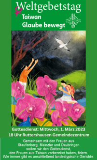 Am ersten Freitag im März wird in über 170 Ländern der ökumenische Gottesdienst zum Weltgebetstag gefeiert. Die Liturgie verfassen jeweils Frauen eines Landes für die ganze Welt. In diesem Jahr kommt die Gestaltung des Gottesdienstes mit dem Thema „Glaube bewegt“ aus Taiwan.