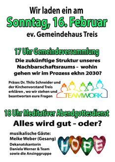 | 18 Uhr | Meditativer Abendgottesdienst zum Thema „Alles wird gut, oder?“ mit Dekanatskantorin Daniela Werner, Noah Bergmann-Franke (Gesang), der Ansinggruppe und dem Gottesdienstteam. Die Kollekte ist bestimmt für die eigene Gemeinde. |