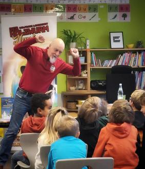 Mit seinen Geschichten rund um Herrn Bombelmann sowie den Holzwurm Hans begeisterte er die Kinder und die Lehrkräfte aller Klassen. Durch seinen lebendigen und lustigen Vortrag nahm er alle Beteiligten mit in die Welt der schusselig-liebenswerten Protagonisten.