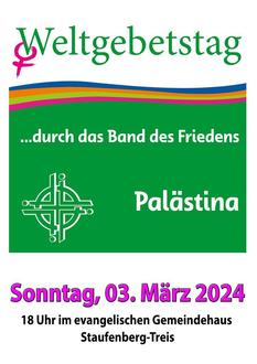 | 18 Uhr | Meditativer Abendgottesdienst im Gemeindehaus zum Weltgebetstag mit Palästina „Das Band des Friedens“ |