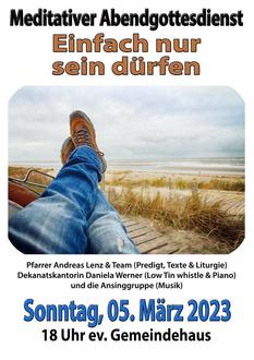 | 18:00 Uhr | Meditativer Abendgottesdienst im ev. Gemeindehaus. |