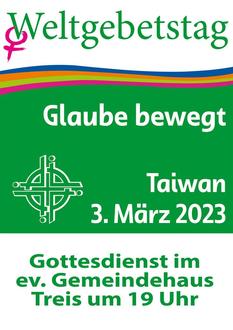 Die Gottesdienstordnung wurde zusammengestellt von Frauen aus Taiwan. Die isolierte Insel, die nur von wenigen Staaten anerkannt ist, wird von der mächtigen Volksrepublik China bedroht. Einige Inseln Taiwans sind nur 3 Kilometer vom chinesischen Festland entfernt. Das Land ist geprägt von vielen Kulturen, Religionen, der Chip-Industrie einerseits und einer abgelegenen Bergwelt andererseits. Zum Weltgebetstag 2023 laden uns mutige Frauen aus diesem kleinen Land ein daran zu glauben, dass wir diese Welt zum Positiven verändern können - egal, wie unbedeutend wir erscheinen mögen. Denn: Glaube bewegt!