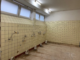 Nach Komplettentkernung und Kompletterneuerung der gesamten Haustechnik (Heizung, Sanitär, Elektroinstallation) bis in die Haustechnikzentrale wurden die beiden vorhandenen Toilettenanlagen aus Ende der 1960er Jahre komplett neu aufgebaut. Trennwände, Deckenheizungen, alle Installationen und Sanitärobjekte, Fliesen samt Unterbau sowie Estrich samt Fliesen und Bodenentwässerung wurden komplett zurückgebaut. In diesem Zuge wurde die Heizung umgebaut auf eine energetisch effektivere Fußbodenheizung mit neuem Fußbodenaufbau und grauen Bodenfliesen. Auf dem ertüchtigten Wandaufbau wurden helle Fliesen mit Farbakzenten verlegt; es wurde eine Akkustikdecke mit LED-Beleuchtung eingebaut und die vorhandenen Fenster ebenfalls in diesem Zuge überholt. Desweiteren wurden neue Trennwände montiert und alle Sanitärobjekte und Accessoires erneuert. Für die sehr gute Ausführung danke ich allen Beteiligten. Besonders danke ich der Schulleiterin Tanja Weiß für die Koordination mit Lehrerkollegium, Eltern und Schülern; die gemeinsamen Absprachen von Schulleitung und Gemeindeverwaltung wurden immer sehr gut an o. G. weiter kommuniziert.