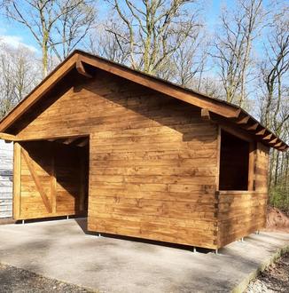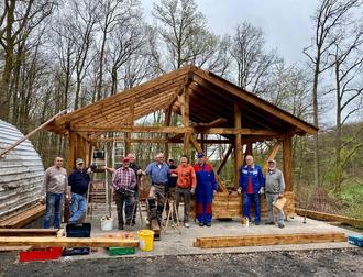 Es hat mich daher sehr gefreut, als Ortsvorsteher Franz-Josef Danneck und sein Stellvertreter Anton Lehnert auf mich zu kamen und den Wiederaufbau durch ehrenamtlich tätige Bürger auf der noch vorhandenen Bodenplatte anboten. Von Seiten der Gemeinde wurde daraufhin umgehend über Umweltministerin Petra Berg ein Zuschuss beantragt und auch genehmigt, anschließend die Lieferung der Holzkonstruktion ausgeschrieben, umgehend vergeben und beschafft. Nach Voranstrich der Holzteile, Vorbereitung sämtlicher Teile und Kleinteile und Montage der Balkenschuhe auf der Bodenplatte durch die motivierte Truppe wurde die Konstruktion nun vollständig in Eigenleistung aufgebaut; die Dacheindeckung über der Holzschalung wird in Kürze geliefert und montiert.