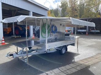 Dieser Spülmobil-Anhänger ist mit einer mobilen Industriespülmaschine, Edelstahlbecken, allen notwendigen Anschlüssen und Verstauflächen ausgestattet. Es kann „zusammengeklappt“ von einem PKW mit Anhängerkupplung transportiert werden. „Aufgeklappt“ ist ein effektives Spülen - ähnlich einer kleine Spülstraße in Gastronomieküchen - damit möglich und Einweggeschirr kann vermieden werden.