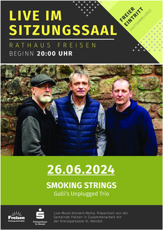 „SMOKING STRINGS“ gastieren am Mittwoch, 26.06.2024, ab 20.00 Uhr, im Rathaus in Freisen bzw. bei gutem Wetter openair auf dem Rathausvorplatz. Ein weiteres Highlight für alle Freunde der handgemachten Livemusik.