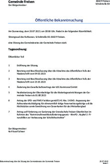 | 5. | Neufestsetzung der Elternbeiträge für die Kindertageseinrichtungen der Gemeinde Freisen ab 01.08.2023 |
