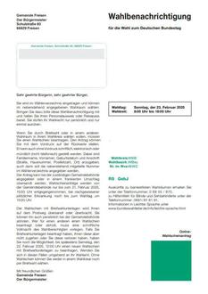 Am Sonntag, 23.02.2025, findet die Bundestagswahl statt. Das Wählerverzeichnis für die Gemeinde Freisen wurde bereits erstellt, sodass Ihnen die Wahlbenachrichtigungen in den nächsten Tagen per Post zugesandt werden. Auf diesen wird Ihnen nochmals der Wahltag und das Ihnen zugeteilte Wahllokal mitgeteilt.