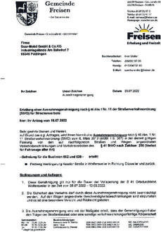 | 1. | Diese Genehmigung gilt nur für die Dauer der Vollsperrung der B 41 Ortsdurchfahrt Wolfersweiler in der Zeit vom 25.07.2022 - 12.08.2022. |