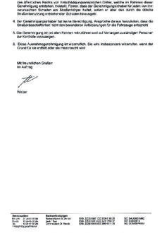 | 3. | Die Ausnahmegenehmigung wird mit der Maßgabe erteilt, dass der Genehmigungsinhaber den Träger der Straßenbaulast oder eine sonstige verkehrssicherungspflichtige Körperschaft des öffentlichen Rechts von Entschädigungsansprüchen Dritter, welche im Rahmen dieser Genehmigung entstehen, freistellt. Ferner, dass der Genehmigungsinhaber für jeden von ihm verursachten Schaden am Straßenkörper haftet, sofern er über den durch die übliche Straßenbenutzung entstehenden Schaden hinausgeht. |