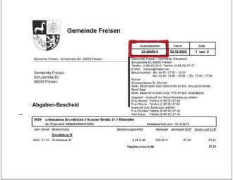 Um eine zügige und ordnungsgemäße Verbuchung der Zahlungen an die Gemeindekasse Freisen zu gewährleisten, werden alle Abgabenpflichtige gebeten, bei ihren Überweisungen immer das 8-stellige Kassenzeichen anzugeben. Es befindet sich im rechten oberen Teil des Abgabenbescheides. Im nachfolgenden Beispiel ist dieses Feld rot umrahmt dargestellt.