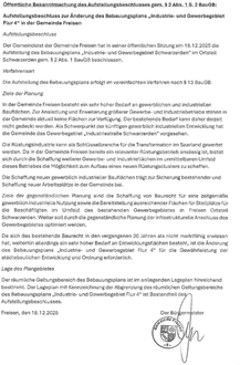 Der Gemeinderat der Gemeinde Freisen hat in seiner öffentlichen Sitzung am 18.12.2025 die Aufstellung des Bebauungsplans „Industrie- und Gewerbegebiet Schwarzerden" im Ortsteil Schwarzerden gem. § 2 Abs. 1 BauGB beschlossen.