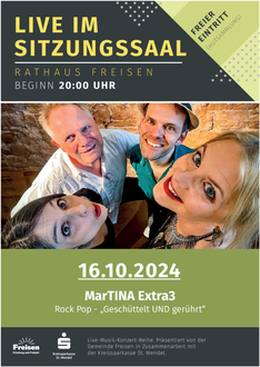 MarTINA Extra 3 nennt sich die nächste Band die im Rathaus in Freisen bei „Live im Sitzungssaal“ auf der Bühne steht. MARTIN & TINA (Tina Skolik & Martin Müller) sind die Namensgeber und bilden mit Gesang und Bass die Basis von MarTINA Extra 3. Beide sind ua auch bekannt durch ihre Bands „acoustic colour“ & „FROM DA SOUL“, mit denen sie seit vielen Jahre weit über die Landesgrenzen hinweg Konzerte spielen. Ergänzt wird das Duo durch das EXTRA an Gitarre und Percussion, nämlich das Saarbrücker Musikerpaar MELANIE CASPAR (Percussion) und ENDI CASPAR (Gitarre & Gesang).