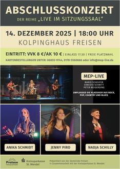 Die Gemeinde Freisen schließt ihr Kulturprogramm auch in diesem Jahr wieder mit einem Konzert in der Adventszeit ab. Für diese besondere Veranstaltung wird das Kolpinghaus in Freisen mit stimmungsvollen Lichteffekten den passenden Rahmen bieten. Auf der Bühne stehen in diesem Jahr neben MEP-Live drei im Saarland und darüber hinaus sehr bekannte Sängerinnen.