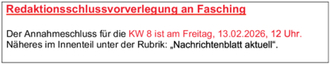 Der Annahmeschluss für die KW 8 ist am Freitag, 13.02.2026, 12 Uhr.