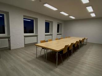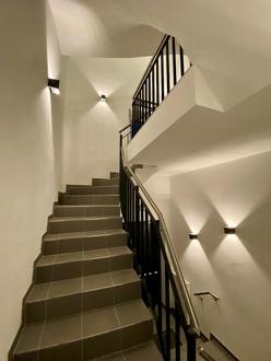 Im Zuge dieser Arbeiten wurde auch die gesamte Haustechnik im Treppenhaus neu geordnet und verlegt sowie der Flur komplett neu verputzt, beleuchtet und – nach Erstellung eines neuen Brandschutzkonzeptes – mit neuen Fluchtpiktogrammen versehen. Im Erdgeschoss und ersten Obergeschoss bleiben die vorhandenen Nutzungseinheiten mit WC-Anlagen erhalten. Decken, Boden und Wände im Gemeindesaal wurden saniert. Das über Jahrzehnte „halb fertige“ Dachgeschoss wurde zu einer Wohneinheit ausgebaut.