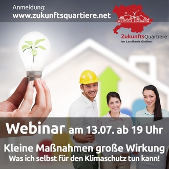 „Kleine Maßnahmen mit großer Wirkung - Was ich selbst für den Klimaschutz tun kann“, so lautet der Titel des Webinars, das am Donnerstag, 13. Juli von 19 bis 20 Uhr, für Sie vom Energieexperten Torben Schmitt angeboten wird. Dieses Mal gibt es gute Tipps, die im Alltag dabei helfen, Energie einzusparen, Verbrauch und Kosten zu senken. Anmeldung zur kostenlosen Teilnahme unter: www.zukunftsquartiere.net/veranstaltungen