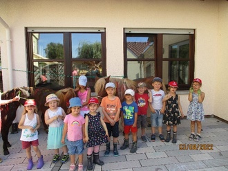 Zum Sommerfest durften die Kinder den ganzen Vormittag auf der Kutsche große Runden auf dem Schulhof drehen. Die Kinder waren so begeistert, dass wir es für eine gute Idee hielten, die Ponys öfter in den Kindergartenalltag mit einzubinden.