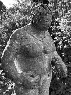 Diese Terrakotta-Skulptur steht im Garten der Staufenberger Künstlerin Christel Dern, die Sie neben vielen weiteren Kunstwerken in der Straße Am Boden 2 A in Staufenberg-Mainzlar besichtigen können