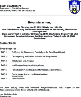 Am Dienstag, den 05.09.2023 findet um 19:00 Uhr eine öffentliche Sitzung des Gemeinsamen Ortsbeirats Staufenberg, Mainzlar und Daubringen statt.