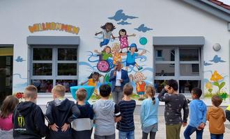Alle Kindergartenkinder und das Team bekamen ein T-Shirt mit dem bunten Bild, das im vergangenen Jahr an unsere Hauswand am Neubau gesprayt wurde. Die T-Shirts wurden über das Bundesprojekt Partnerschaft und Demokratie finanziert. DABEISEIN ist ein Zusammenschluss von 6 Kommunen im Landkreis, die Projekte, wie dieses finanziell unterstützen.