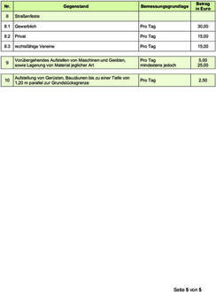 | (4) | Ist in dem Gebührenverzeichnis eine Sondernutzungsart nicht enthalten, ist die Gebühr nach derjenigen Sondernutzungsart des Gebührenverzeichnisses zu bemessen, die nach Art und Ausmaß der Einwirkung auf die Straße und den Gemeingebrauch sowie nach dem wirtschaftlichen Interesse des Gebührenschuldners der beantragten oder ausgeübten Sondernutzung am ehesten gleichkommt. | |