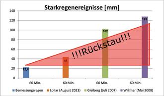 Das nachstehende Diagramm verdeutlicht, ab welchem Niederschlagsvolumen innerhalb von 60 Minuten (mehr als 22,4 mm) die Kanäle hydraulisch überlastet werden können, was zu Rückstau führen kann.