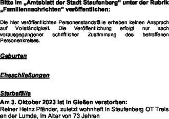 Die hier veröffentlichten Personenstandsfälle erheben keinen Anspruch auf Vollständigkeit. Die Veröffentlichung erfolgt nur nach vorausgegangener schriftlicher Zustimmung des betroffenen Personenkreises.