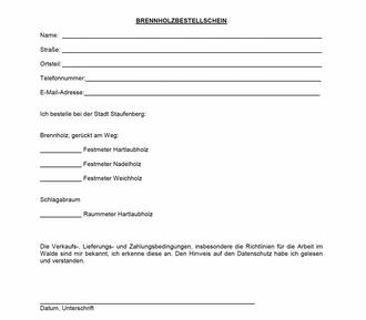 | 6. | Ein Recht auf Zuteilung der gewünschten Menge und Holzart besteht nicht. Die Stadtverwaltung behält sich das Recht auf Kürzung der bestellten Brennholzmenge vor. | |
