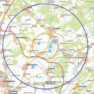 Für alle Haltungen im Umkreis von zehn Kilometern um den Ausbruchsort bestehen besondere Beschränkungen (Überwachungszone, blauer Kreis). Nochmals gesonderte Regelungen bestehen drei Kilometer rund um den Ausbruchsort (Schutzzone, orangefarbener Kreis). (Grafik: Landkreis Gießen)