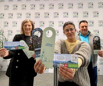 Sie stellen das Werbematerial für die Kampagne der SWS zu „Jung kauf Alt“ vor: (v. l.) Landrätin Anita Schneider, Negar Jahadi, Geschäftsführerin der SWS, Hagen Roth, Fachdienstleiter Kreisentwicklung und Strukturförderung. (Foto: Landkreis Gießen)