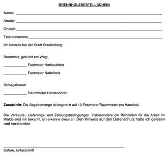 | 10. | Alle Bestellungen müssen schriftlich per Bestellschein aus den Staufenberger Nachrichten oder elektronisch über die Homepage der Stadt Staufenberg erfolgen. Die Bestellung für Brennholz / Schlagabraum ist umgehend bis spätestens 20. Dezember auszufüllen und mit einer Kopie des Nachweises über einen Motorsägenkurs bei der Stadtverwaltung Staufenberg, Tarjanplatz 1, 35460 Staufenberg abzugeben. Der Bestellschein ist rechtsverbindlich. Bei fehlender Unterschrift durch Bestellschein ist die Bestellung ungültig. |