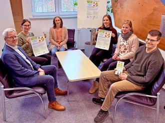 Treffen Vorbereitungen für den bevorstehenden DUOday im Landkreis Gießen (v. l.): Sozialdezernent Frank Ide, Tina Weckler (EAA), Rabea Dietrich (Lebenshilfe Gießen), Larissa Albohn (EAA), Yella Alban (Lebenshilfe Gießen) und Michael Volter (Landkreis Gießen).