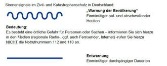 In Kommunen, in denen derzeit noch nicht das Sirenensignal „Warnung der Bevölkerung“ ausgelöst werden kann, da die technische Umstellung noch nicht abgeschlossen ist, soll im Rahmen des Warntages ersatzweise das Signal „Feueralarm“ ausgelöst werden.