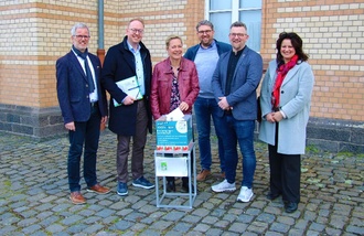 Sie schicken gemeinsam die Ideenbox des Projekts „Inklusiver Landkreis“ auf die Reise (v. l.): Sozialdezernent Frank Ide, Bürgermeister Dr. Julien Neubert (Lich), Bürgermeisterin Patricia Ortmann (Biebertal), Bürgermeister Marius Reusch (Langgöns), Bürgermeister Jan-Erik Dort (Lollar) und Projektbeauftragte Dr. Michaela Fink. (Foto: Landkreis Gießen)