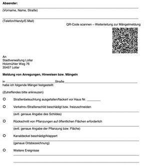 Auf unserer Internetseite www.lollar.de finden Sie ebenfalls auf der Startseite einen Link zur Mängelmeldung (Landesweiter Mängelmelder).