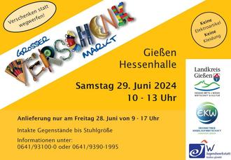 der Eigenbetrieb Kreislaufwirtschaft Landkreis Gießen veranstaltet in diesem Jahr wieder in Zusammenarbeit mit der Jugendwerkstatt Gießen gGmbH einen Verschenkmarkt. Er wird in den Hessenhallen Gießen stattfinden.