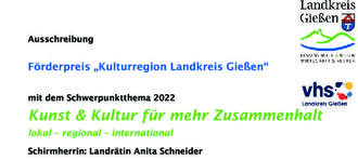 Deshalb lautet das Motto des Förderpreis Kulturregion Landkreis Gießen 2022 „Kunst & Kultur für mehr Zusammenhalt - lokal - regional - international“.