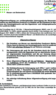 Allgemeinverfügung zur vorübergehenden Untersagung der Wasserent-nahme aus oberirdischen Gewässern in Hinblick auf die Entnahme im Rahmen des Gemeingebrauchs und des Eigentümer- und Anliegergebrauchs im Landkreis Gießen