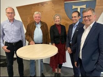 Sie rufen gemeinsam zum Mitmachen für den ersten Präventionspreis auf: (v. l.) Siegfried Schulz, der ehemalige Ministerpräsident Volker Bouffier, Landrätin Anita Schneider, Vize-Polizeipräsident Torsten Krückemeier und Oberbürgermeister Frank-Tilo Becher. (Foto: Landkreis Gießen)