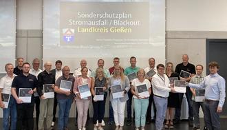 Gemeinsame Vorsorge: Dr. Konstantin Hartmann von der KomRe AG (vorn, rechts) übergab 19 Notfallpläne für flächendeckenden Stromausfall an Landkreis und Kommunen, die nun in die weiteren Einsatzplanungen vor Ort einfließen werden. (Foto: Landkreis Gießen)